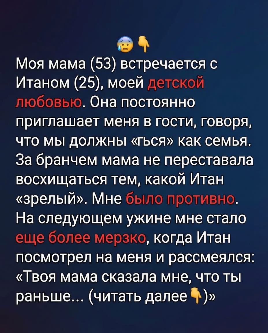 Моей маме пятьдесят три, и несколько месяцев назад она как-то между делом сообщила мне, что встречается с мужчиной по имени Итан. В тот же миг, как она произнесла его имя, у меня внутри всё оборвалось. Не потому, что это было распространённое имя. А потому, что я точно знала, кто такой Итан. Он не был незнакомцем … Read more